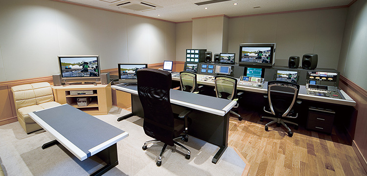 SD/HD編集に対応のリニア編集室です。高機能なキャラクタージェネレーターや字幕入れシステムを始め、最新の光点滅計測装置を完備。放送用の映画、アニメーション作品から番組、VP、CM、イベント映像まであらゆるニーズの映像制作に対応可能なシステムで構成されています。また、マルチフォーマットディスクレコーダー D-Streamにより、ファイル素材から直接SDI出力が可能となり、23.98psfから29.97iへのトランスコードにも対応。中間素材の作成も不用でスムーズな編集が可能です。さらに、ゆったりとした広めのクライアントチェックスペースをご用意しております。