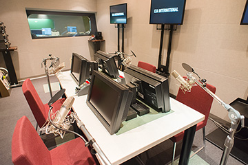 アナウンスブースは、通常座りで3~4本、立ちで3本のマイクの設置が可能なため、ゲームやアニメのアフレコ、映画のコメンタリーなどの掛け合い収録に対応しています。また、人数に合わせて32インチモニターを3台までご用意しております。